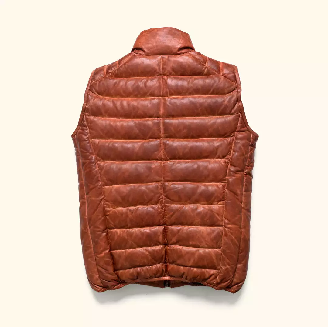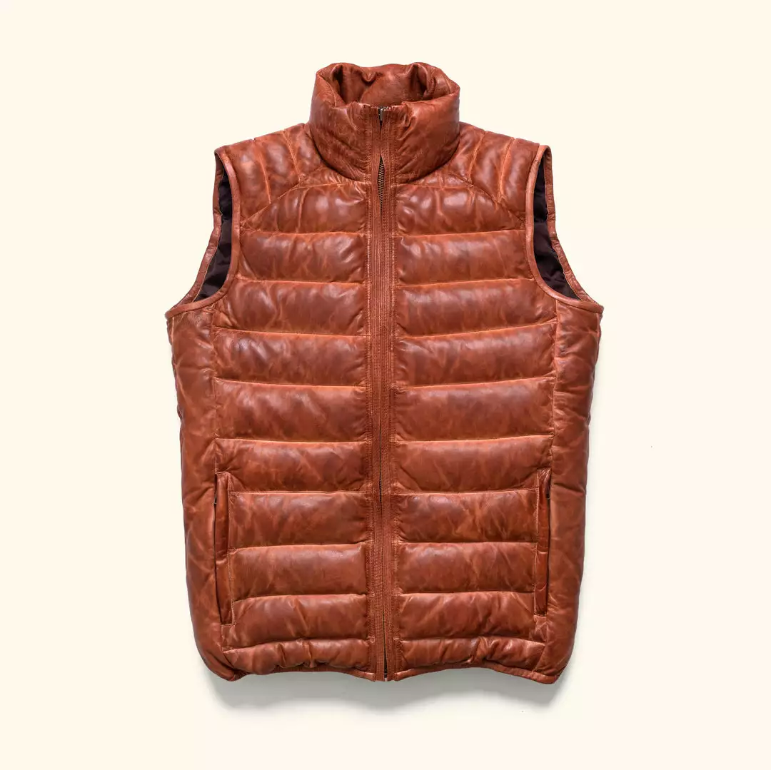 The natural, lightweight layers of the lambskin leather give it a distinctive, velvety texture that is exceptionally soft and wearable. Even though lambskin leather is thin and lightweight, it still does a good job of keeping out the cold, making it an ideal material for a leather down vest. Because of its delicate structure, lambskin is treated less harshly in production than cowhide and requires more hand manipulation. This often results in lambskin being more expensive than cowhide, which is why it’s generally reserved for premium leather products like this brown puffer vest.