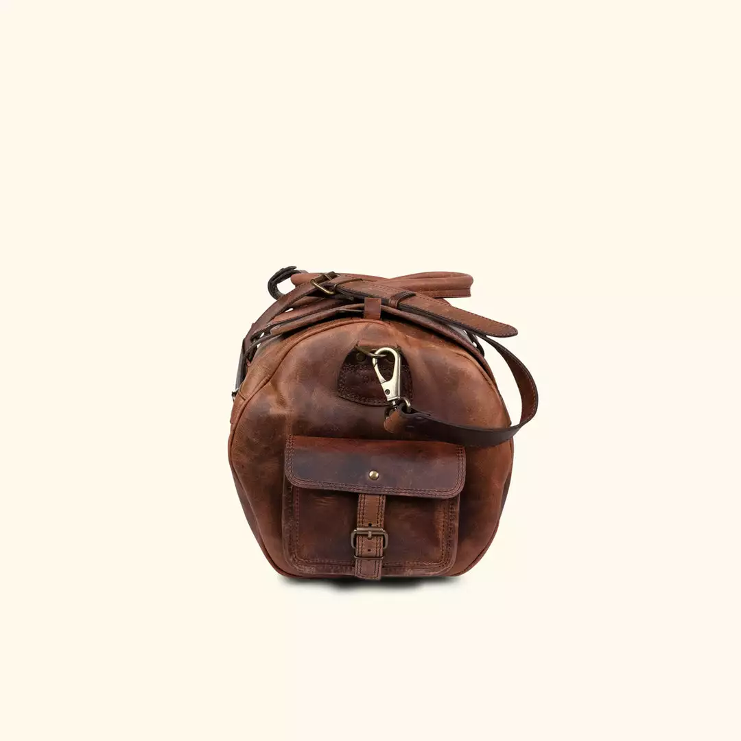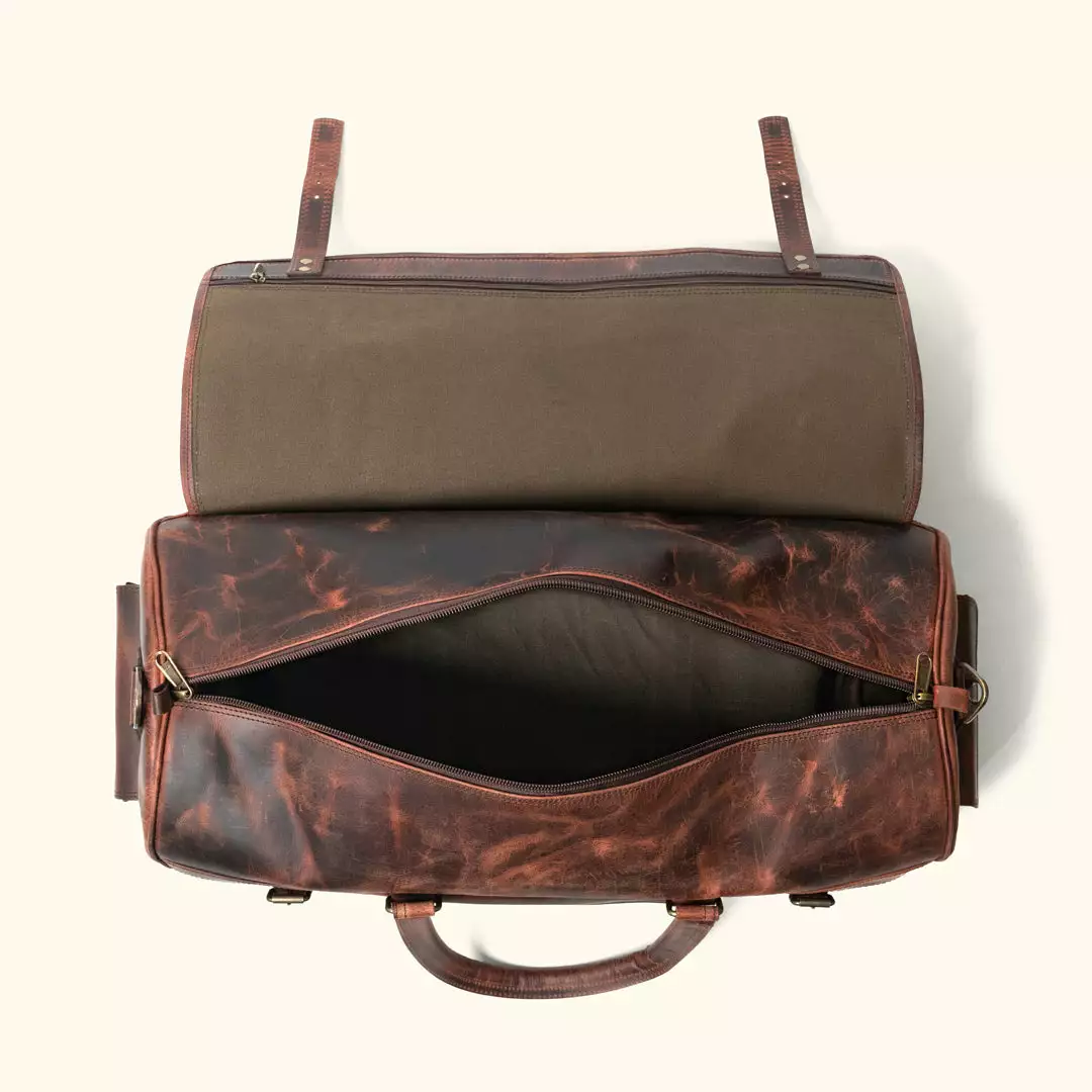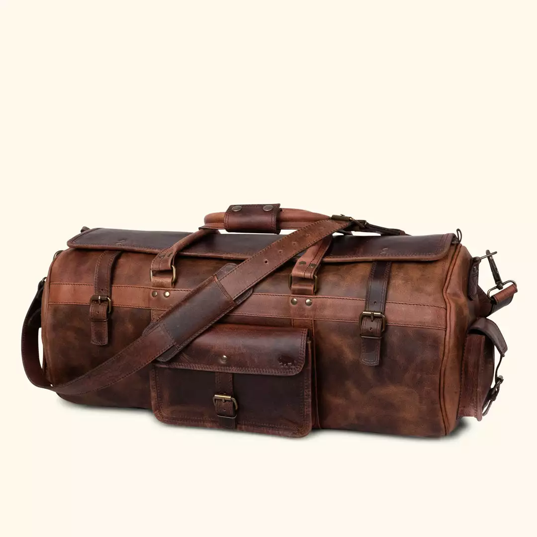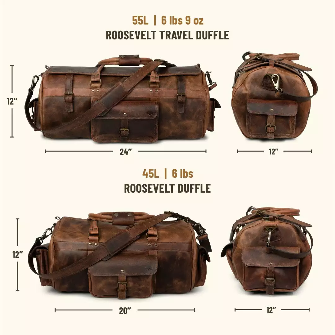 March 1909. Our Roosevelt Buffalo Leather Travel Duffle Bag is constructed from thick, durable water buffalo hide and features a green canvas lined interior and genuine brass and iron hardware. With 3 exterior buckled pockets, zipper-closing main compartment, and top flaps with straps for added security, this bag is ready for travel. Easily carry it on your shoulder or in your hands with the adjustable shoulder strap and sturdy carry handles. At 24” long, 11” wide, and 11” high, it’s designed with enough room to hold everything you’ll need for weekend to week-long adventures.